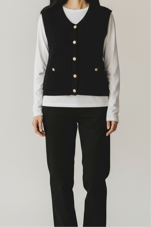 CHALECO CON MINI BOLSILLOS Y BOTÓN DORADO
